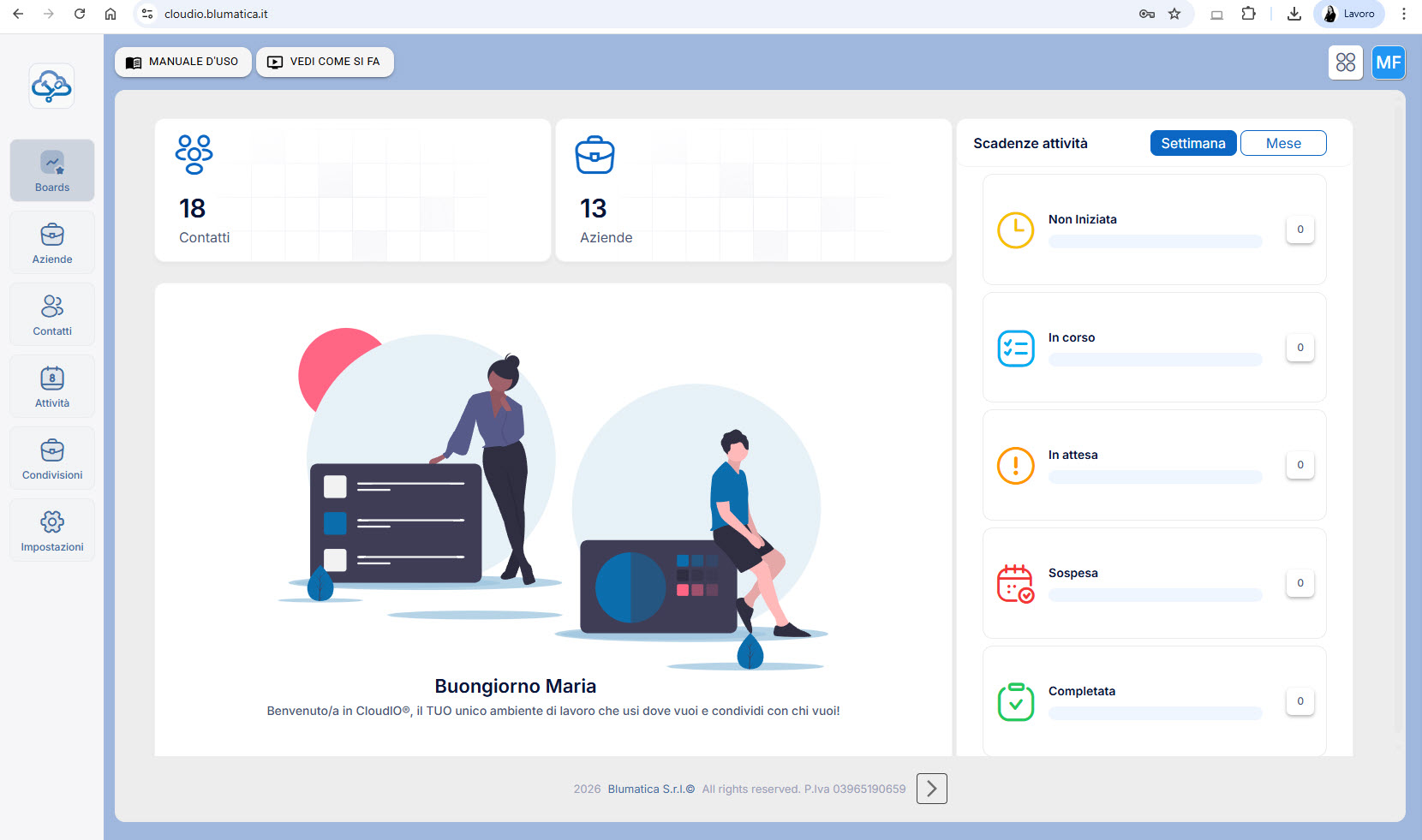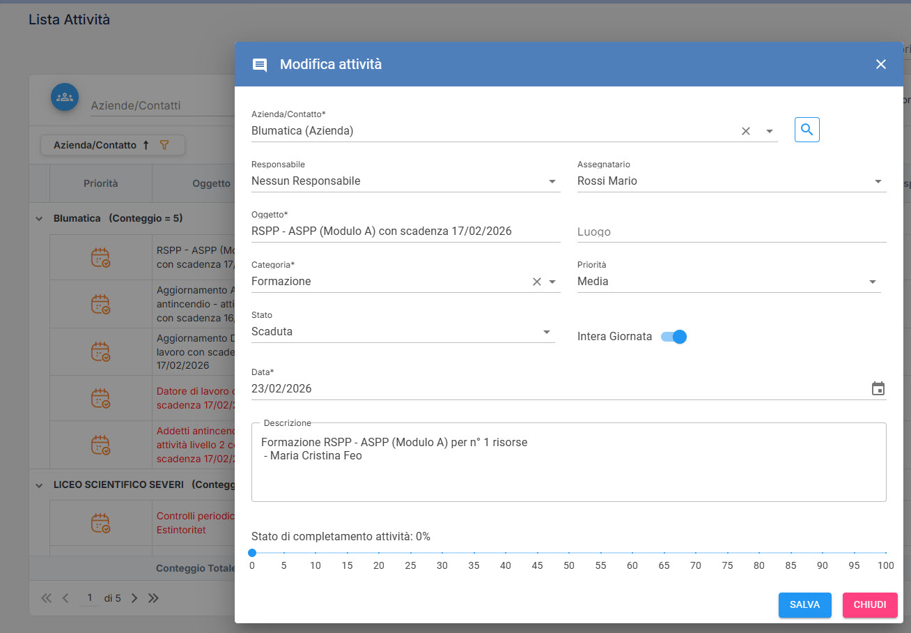 Software per la gestione di contatti e clienti. Ideale per Consulenti HSE, Professionisti e Piccole Imprese con necessità di pianificare, gestire e monitorare le attività del proprio ufficio per ogni commessa e prodotto/servizio offerto.