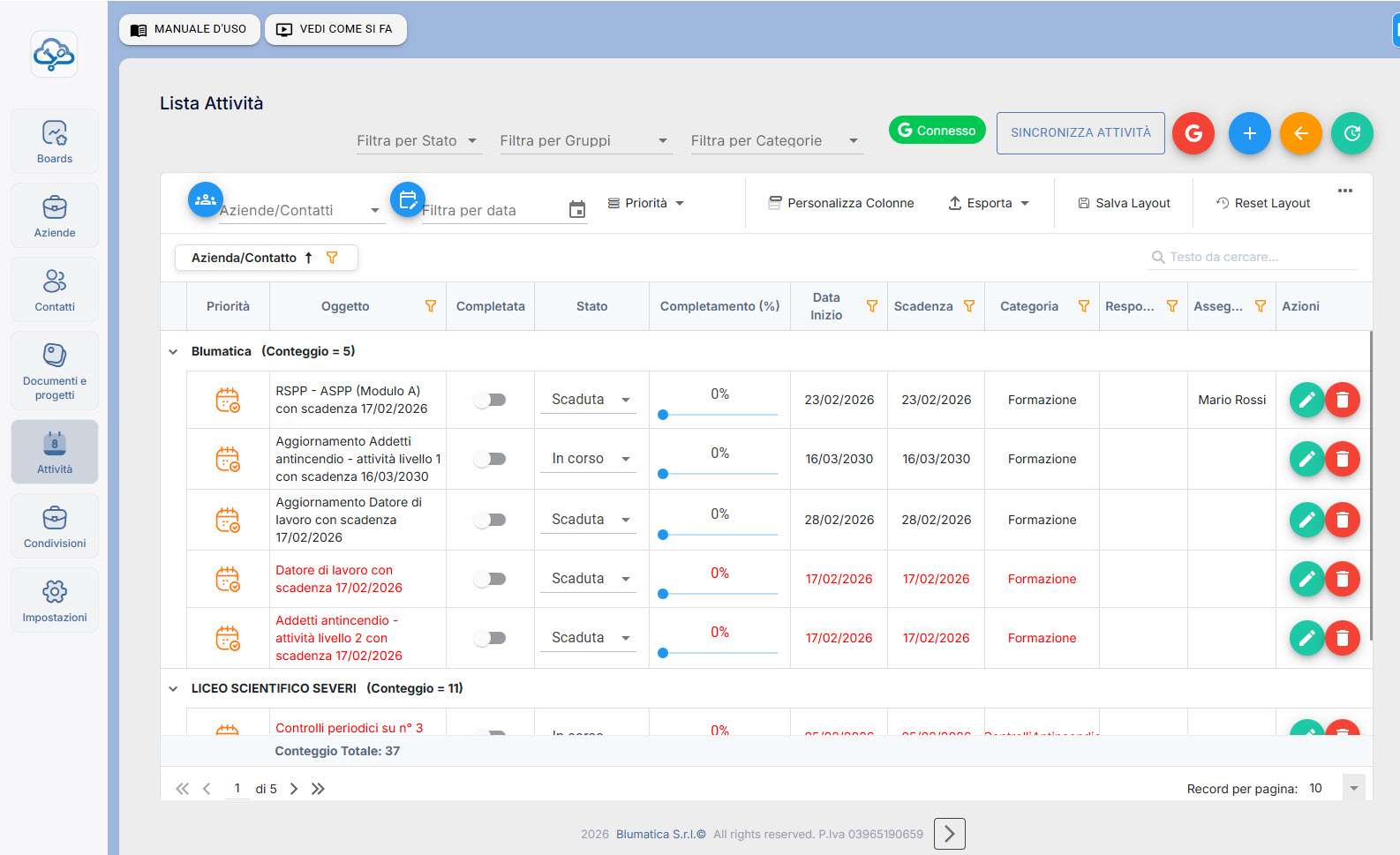 Hai sotto controllo tutte le attività in un unico ambiente di lavoro e puoi assegnarle ai tuoi collaboratori seguendone lo stato di avanzamento. Lo scadenzario si auto-istruisce in base ai software collegati (salute e sicurezza, formazione, antincendio, ecc.).
