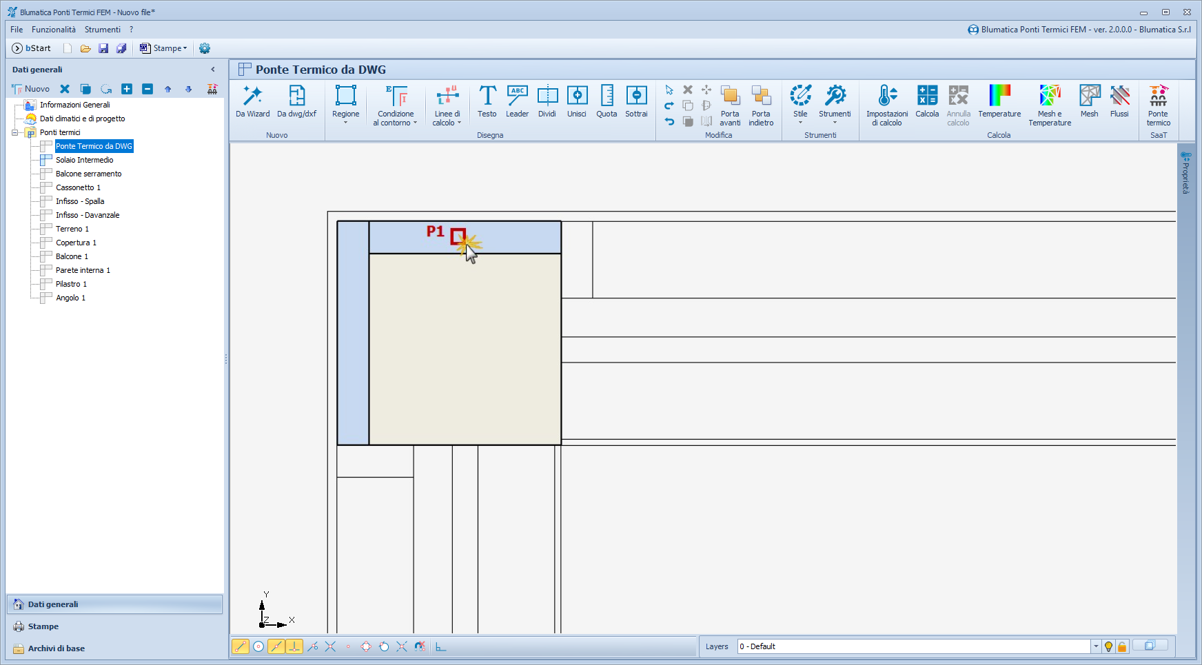 Modelli sia disegnando liberamente la geometria del ponte termico partendo anche da un file DWG/DXF di sfondo, sia attraverso un Wizard parametrico che ti guida nella selezione della tipologia di ponte termico e nella definizione dei dati geometrici e termici (materiali e condizioni al contorno) per le configurazioni più comuni.
