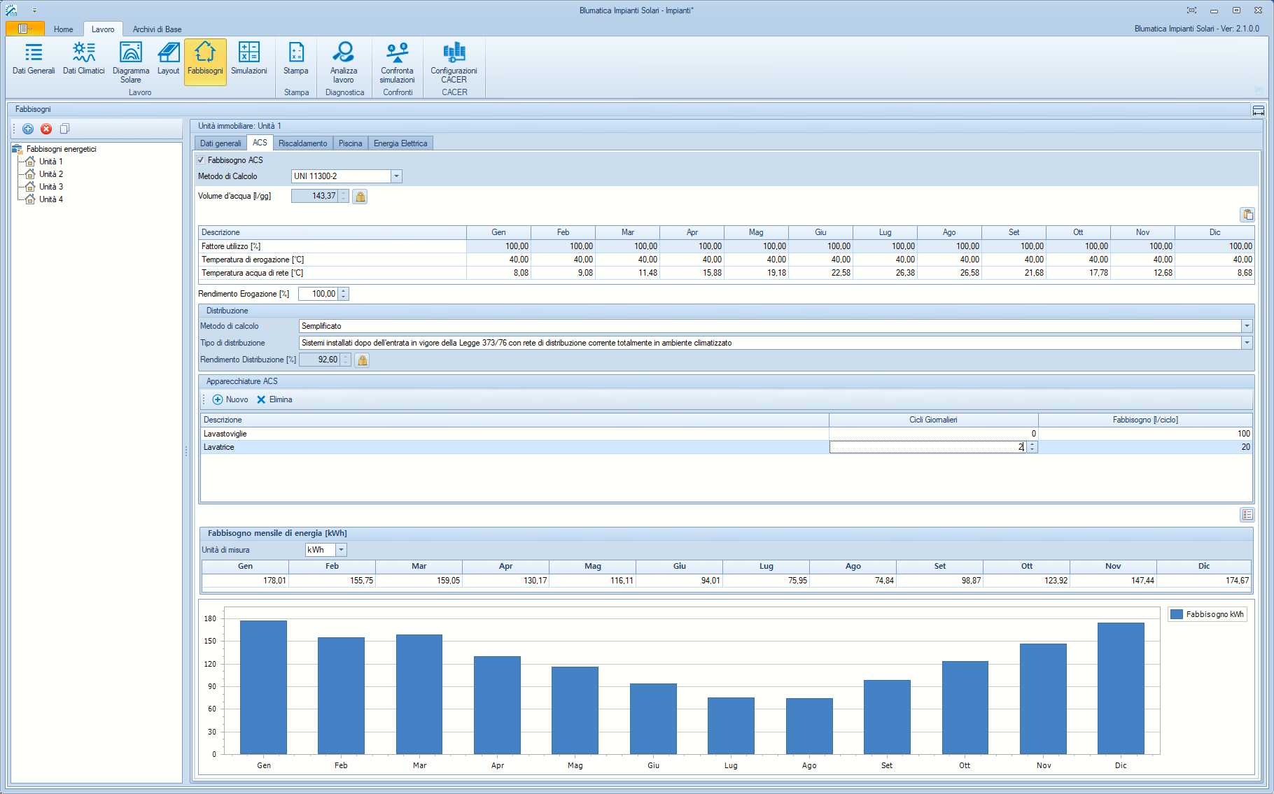 possibilità di inserimento e calcolo automatico dei fabbisogni ACS, Piscine e Riscaldamento.