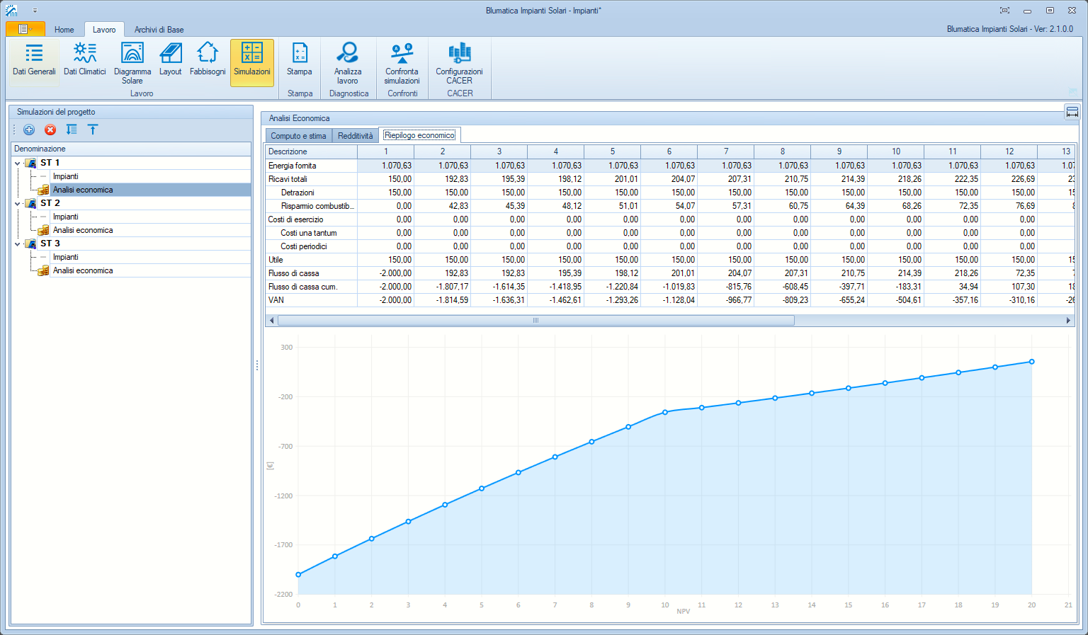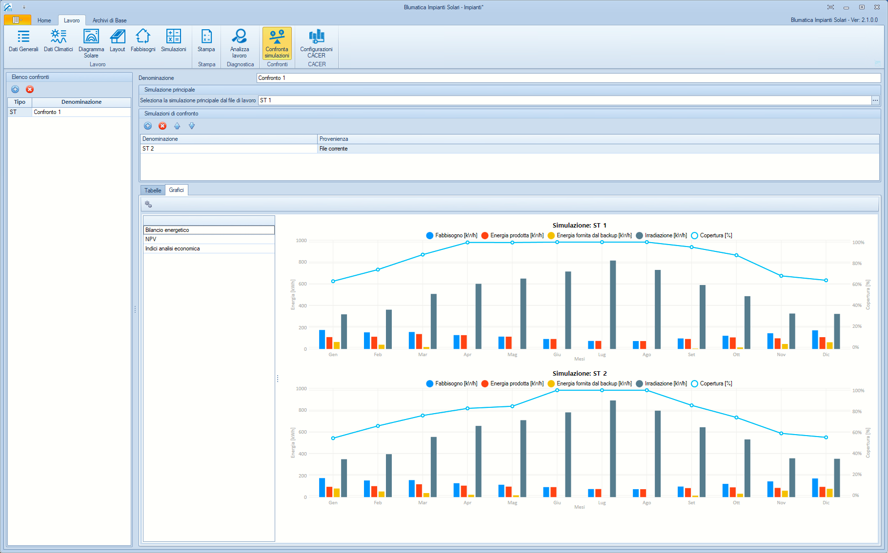Grafici di riepilogo tecnici e professionali relativi all’analisi tecnico-economica, con possibilità di confronto tra le varie simulazioni e con riepilogo di grafico su competitività su ogni parametro per permettere all’utente di scegliere in modo rapido la migliore configurazione impiantistica per soddisfare ogni esigenza.
