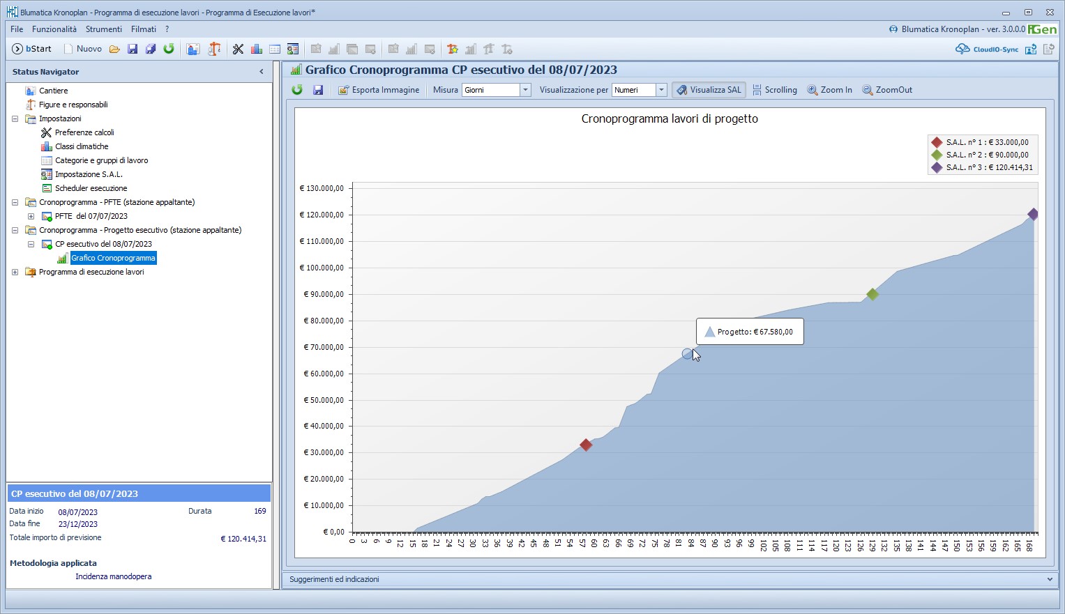 Il programma di esecuzione dei lavori fornisce le variazioni rispetto al progetto sia nel diagramma di Gantt per ogni singola attività, sia nel grafico di cronoprogramma economico tramite l’indicazione degli importi maturati ad ogni giorno.